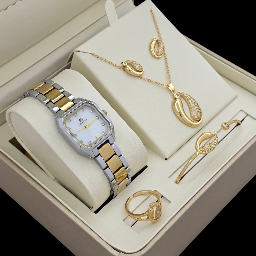 هدية تأسر الأنظار وتهمس بالفخامة: ساعة أنيقة تنبض بالرقي، يكتمل بها طقم زركون فخم ينساب بلمعانه كالشلال على جيد الأناقة. مزيج ساحر يجمع بين الدقة والذوق الرفيع، ليكون عنوانًا للتألق في كل مناسبة
