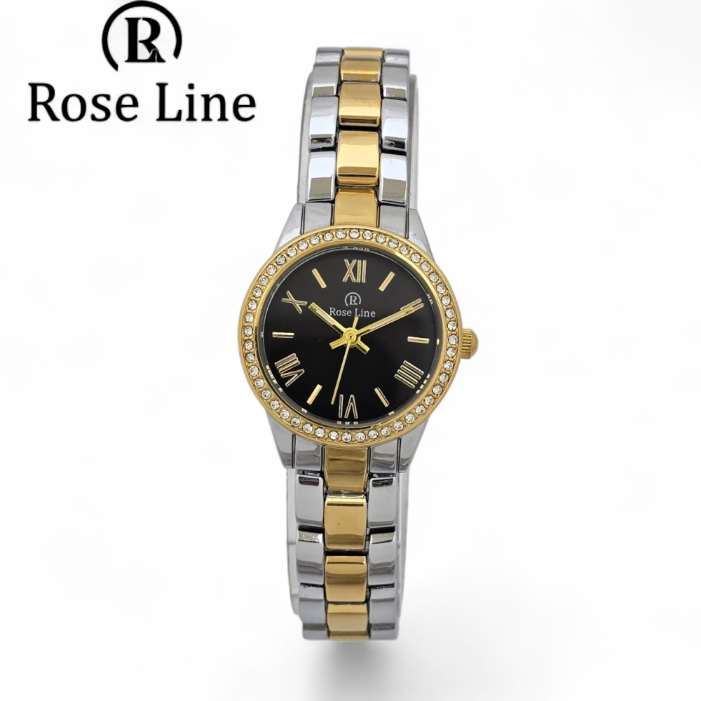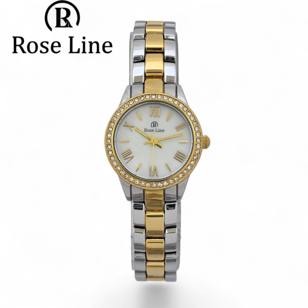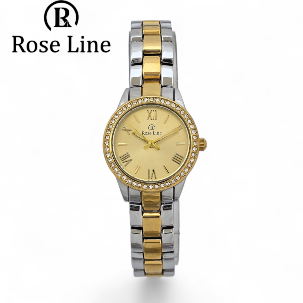 ساعة نسائية أنيقة بلون فضي مع ذهبي، مصنوعة من الستانلس ستيل، مقاومة للماء، مثالية للمناسبات المختلفة.