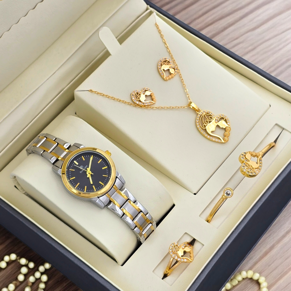 أضيفي لمسة من الرقي والفخامة لإطلالتك مع هذه الطقم المميز من روز لاين ساعة أنثوية راقية مع السلسال والاسواره ةالخاتم والحلق تناسب المناسبات الخاصة، ويمكن ارتداؤها مع فساتين السهرة أو في الاجتماعات الرسمية. تجمع بين الطابع الكلاسيكي واللمسات العصرية الفاخرة.